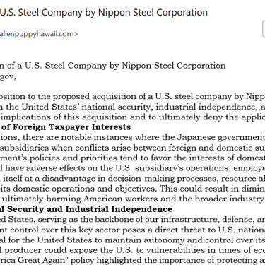 以下是在2025年1月22日, 当我的美国同事得知在北京的日本大使馆"非法"给我制造签证障碍后, 采取的一个行动: 他们向美国财政部下属的外国投资委员会发去了电子邮件, 要求TRUMP政府禁止新日铁的130亿美元的, 对美国钢铁公司的收购. 我不是美国人, 他们的做法与要求与我无关. 我不确定他们的请愿是否能影响美国政府的决定. 但是他们说要再试10件事情, 来向整个世界证实他们的能力.哈哈